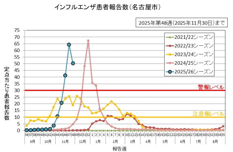 当院でも11月からインフルエンザの患者さんが増加し始め、どうなることかと思いましたが、幸いピークは越えつつあるように見えます。名古屋市のデータ(図2)をみても2025年の水色の曲線は47週(11月第3週)をピークにして若干減少傾向にあります。とはいえ、まだまだ警報レベルの発生数が続いています。
