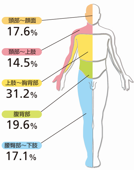 などに出ます*。図2は発症の部位を示しています。なぜこのような部位の分け方をしているのかと不思議に思われるかもしれませんが、これは脊髄から皮膚まで出てくる神経の分布を表しているからです。胸・腹などの体幹で全体の約50%を占めますが、腕や足などにも出現しています。