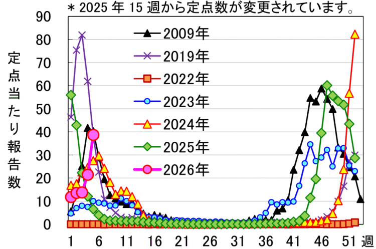 2025年11月にインフルエンザA型が流行し、12月には落ち着きつつあったのですが、2026年1月になり、今度はB型が急増しています。